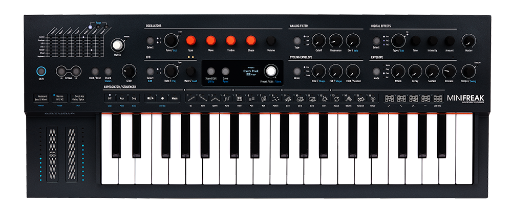 MiniFreak — это полифонический гибридный синтезатор, который сочетает в себе два цифровых звуковых движка с тёплыми аналоговыми фильтрами, вдохновляющей модуляцией, непредсказуемыми секвенциями и богатыми стереоэффектами для ваших тембров: одновременно и необычных, и красивых, и хаотичных.
